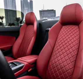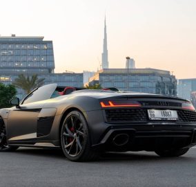 The black 2023 Audi R8 Spyder is the only open-top V10 supercar available to rent in Dubai. The 5.2 litre naturally aspirated V10 produces 570 horsepower and pulls all the way to 8,700 rpm with a sound that no turbocharged convertible can replicate. In black with the red quilted leather interior, this is one of the most visually striking combinations available to rent in the city.